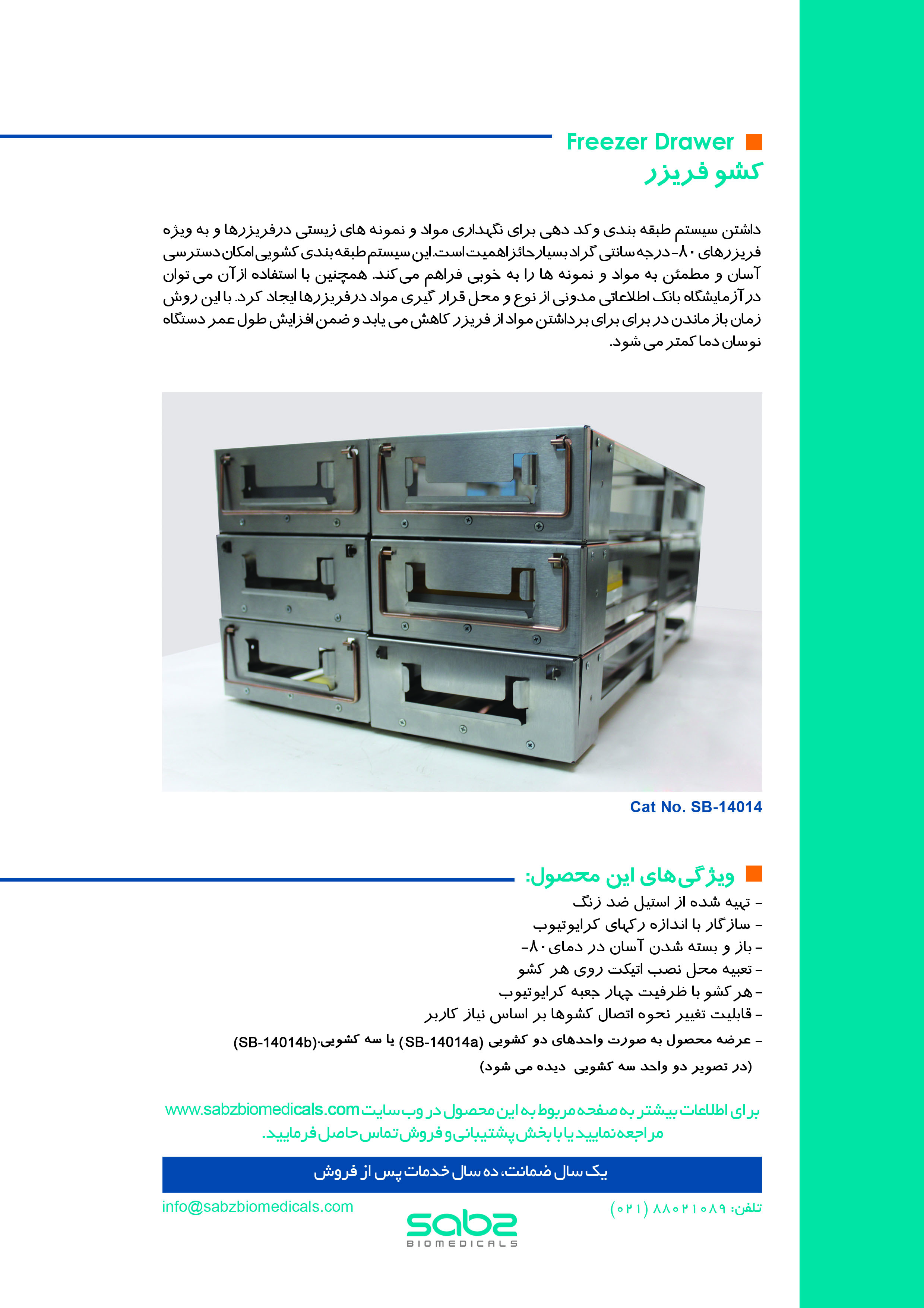 این محصول در دو اندازه دو کشویی (SB-14014a) و سه کشویی (SB-14014b) عرضه میشود و کاربر بسته به ابعاد فریزر خود میتواند تعداد مورد نیاز از واحدهای دوتایی یا سه تایی را درخواست کند. در تصویر بالا دو واحد سه کشویی در کنار هم قرار داده شده است.