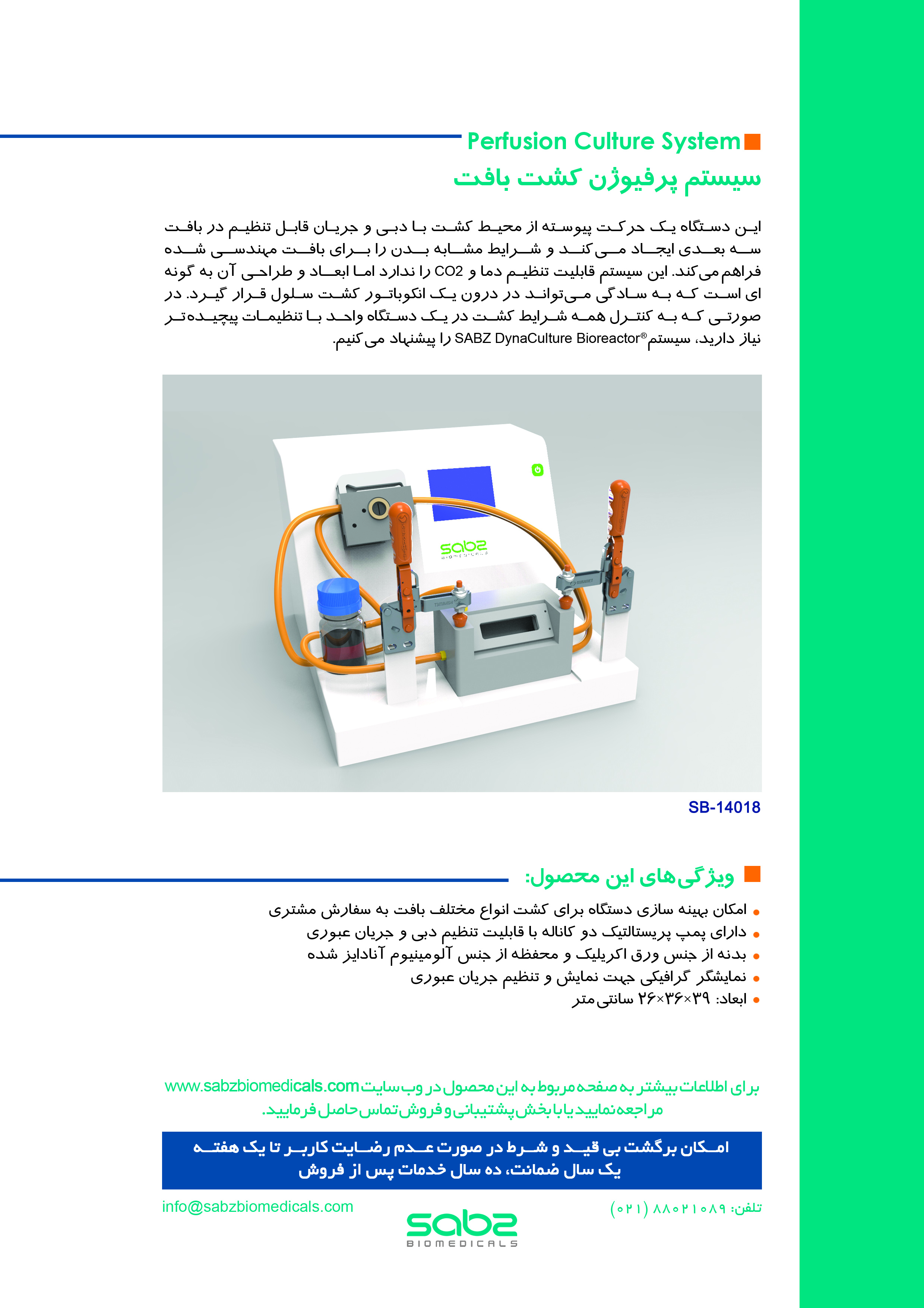 این دستگاه یک حرکت پیوسته از محیط کشت با دبی و جریان قابل تنظیم از داخل بافت سه بعدی ایجاد میکند و شرایط مشابه بدن را برای بافت مهندسی شده فراهم میکند. این سیستم قابلیت تنظیم دما و CO2 را ندارد اما ابعاد و طراحی آن به گونهای است که به سادگی میتواند در درون یک انکوباتور کشت سلول قرار گیرد. در صورتی که به کنترل همه شرایط کشت در یک دستگاه واحد با تنظیمات پیچیدهتر نیاز دارید، سیستم SABZ DynaCulture® Bioreactor را پیشنهاد میکنیم.