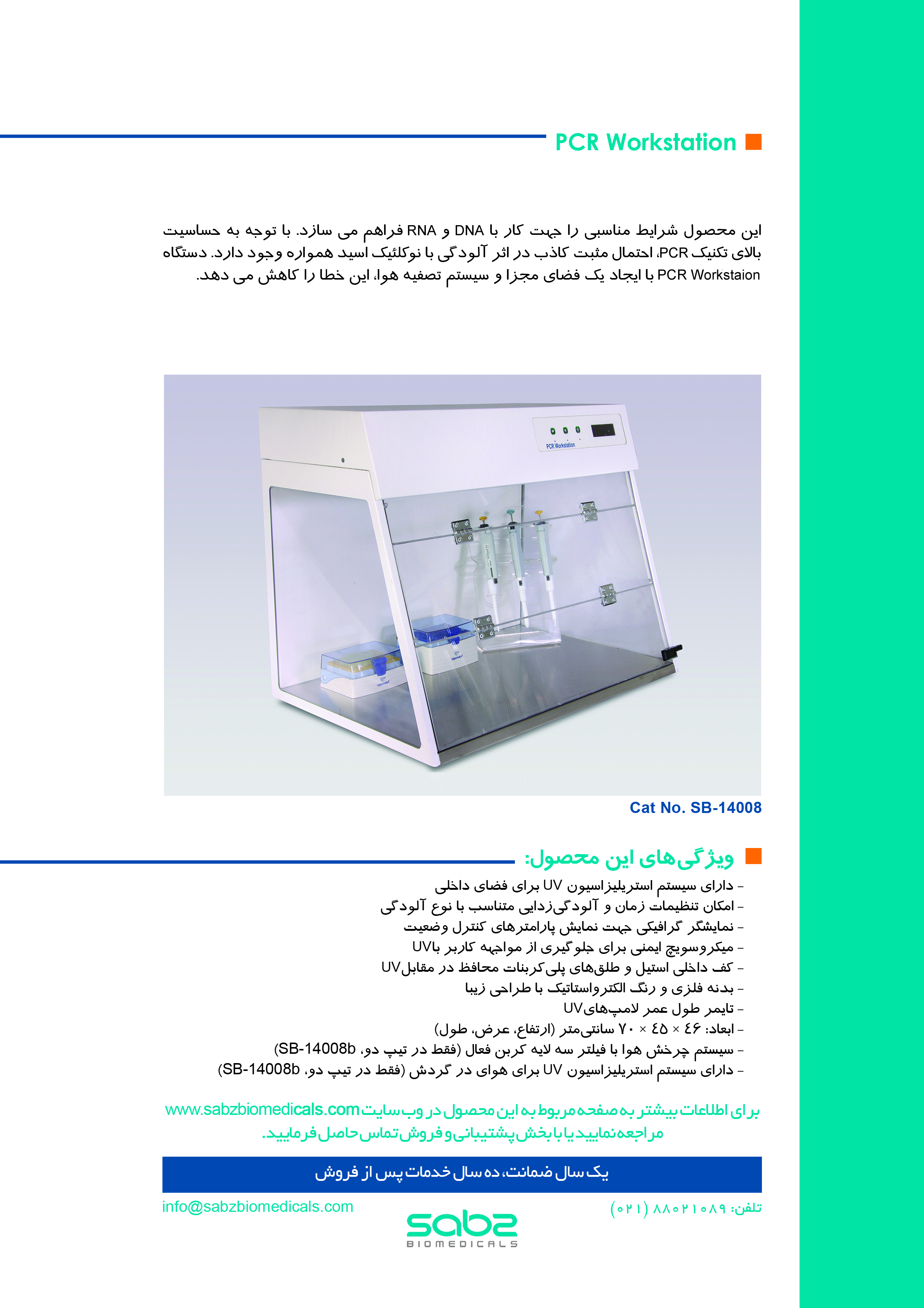 با توجه به حساسیت بالای تکنیک PCR، احتمال مثبت کاذب در اثر آلودگی با نوکلئیک اسید همواره وجود دارد. دستگاه PCR Workstaion با ایجاد یک فضای مجزا و سیستم تصفیه هوا، این خطا را کاهش میدهد این دستگاه در دو مدل AC plus (با سیستم چرخش هوا) و AC minus (بدون سیستم چرخش هوا) تولید میگردد.